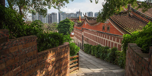 这里水景多变,山光迷人。霞客古道的尽头便是妈祖阁,这里曾是《妈祖》的拍摄地,现场还留有许多剧照。剧中搭建的妈祖居住的木屋改成了茶馆,可在此品茗小憩一会儿,欣赏山中美景,林中隐约露出的寺庙,颇有些深山藏古寺的意蕴。