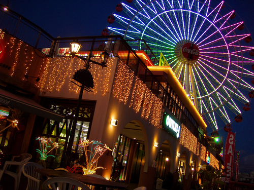 由购物和饮食的小店组成。如果是从那霸市出发的话,坐BUS到“軍陸病院前”下车徒步5分钟便可以走到。由于有醒目建筑——可口可乐标志的摩天轮引导一般不会让人错走冤枉路,作为美国村最明显的标志建筑坐落在村口的十字路口。高度为60米,可以称得上是北谷[American village]象征的大摩天轮。在最高处可以将北谷的街景和东海一览无遗。夜晚的摩天轮在彩灯的照耀下营造出一种浪漫的氛围,作为情人约会的人气场所专用灯光真可称得上是首屈一指哦!在这座建筑中还设有各种商店以及游戏机中心、餐饮广场。村子旁边有条小河,一片美式的建筑加上满眼的英文,让人有种置身美国的错觉。若不是冲绳特色的小狮子玩具装点着这里,再加上零星日本特色的拉面店,还以为已经置身夏威夷了。