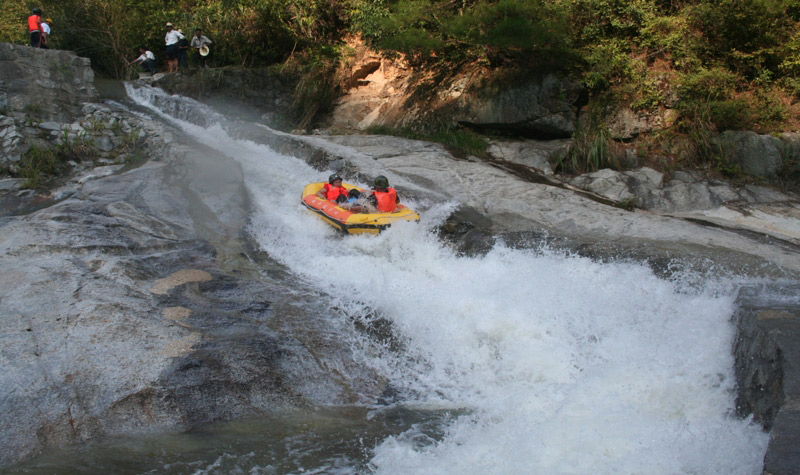 漂流河道焕新河,由30多条小山溪汇集而成,长达30公里,总落差160米,泉水冰凉清澈,蜿蜒而下,水流湍急,一路欢笑奔向山外的大世界。