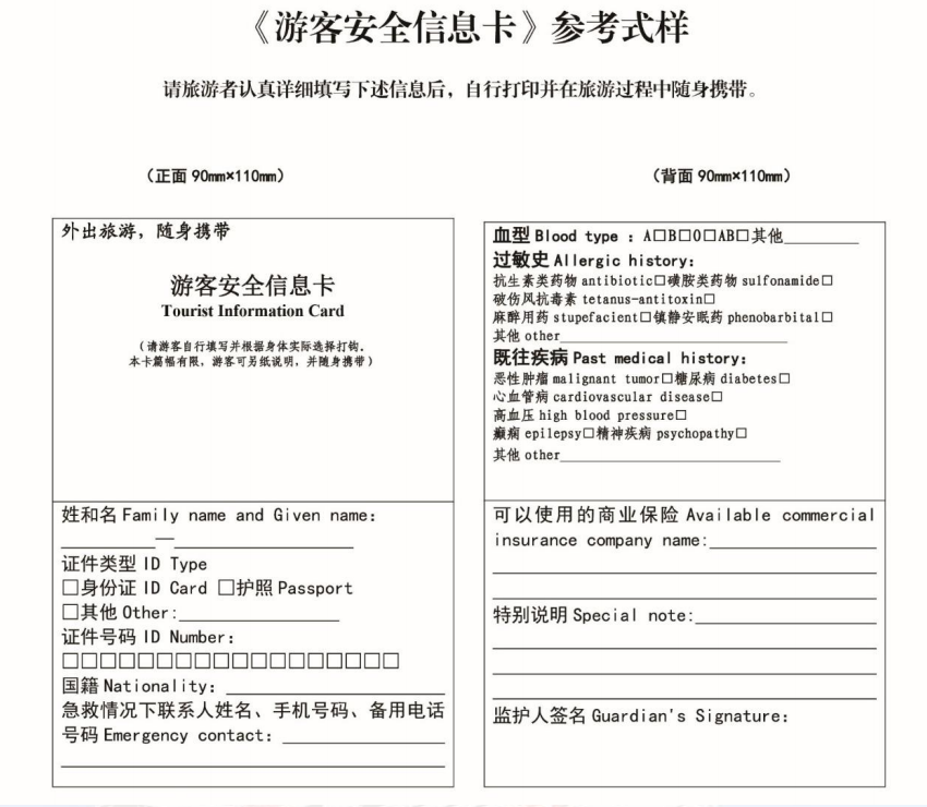 1. 行程最后附《游客安全信息卡》,请旅游者认真详细填写下述信息后,自行打印并在旅游过程中随身携带。