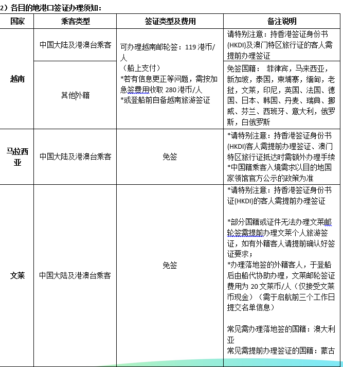 - 邮轮上消费均以港币结算。船上任何消费、购物等均以记账方式(娱乐场除外),下船前请以本人名下的外币信用卡(Visa卡、万事达卡等)或现金结算。