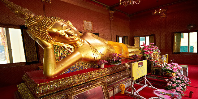 卧佛寺又名越菩寺,是曼谷最古老也是最大的寺院。寺庙紧邻大皇宫的南面,漫步寺内,映入眼帘的是巍峨的佛塔,红顶的寺院,红绿黄相间的泰式鱼脊形屋顶的庙宇,充满了神秘的东方色彩。