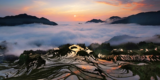 云和梯田是华东地区的大规模梯田,这里除了层层叠叠的梯田和云海日出,5-6月播耕时还能看到漂亮的水景,10月稻谷成熟和冬天的雪景也分外迷人,吸引了不少摄影爱好者来此采风。