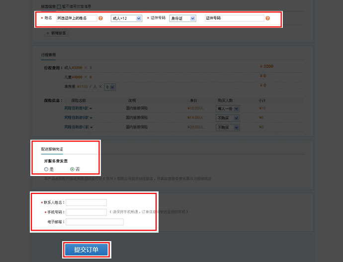 第三步:点击预订,选择出行日期后,填写出游人信息,发票的配送以及联系人信息。