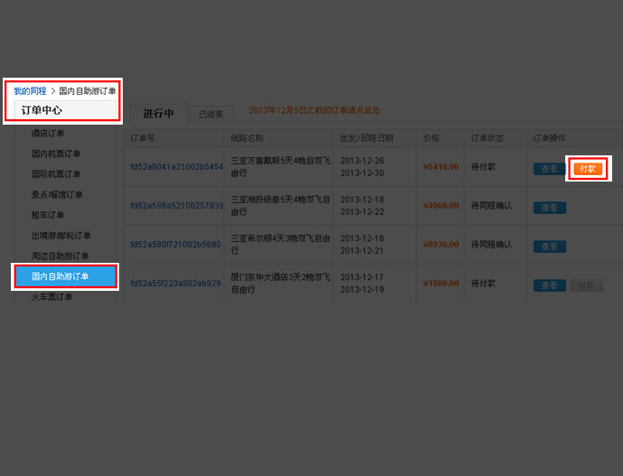 第五步:线路行程以及价格确认无误后,客服将开通订单支付权限,您可以进入到订单中心中,找到已有订单进行付款。