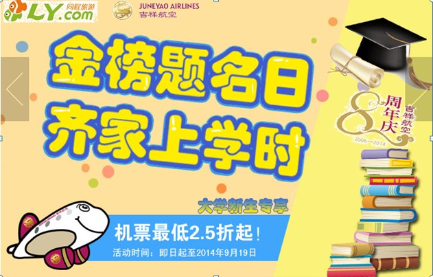 产品限购说明:吉祥航空携手同程旅游针对今年高考、考研、考博的考生推出莘莘学子特价机票,凭录取通知书可享受该价格。