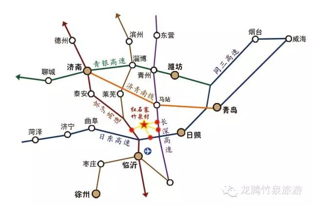 临沂市沿沂蒙路往北→路过张庄镇→到达沂南县城→往北到达铜井镇→左转5公里即可到达竹泉村·红石寨