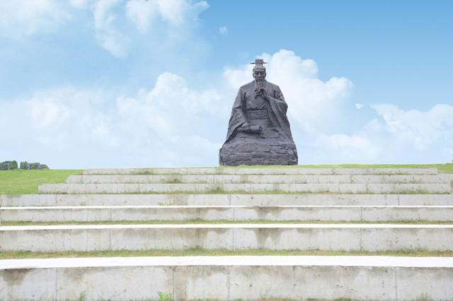 纪念园的制高点是高13米寓意《孙子兵法》十三篇的孙武铜像,正襟危坐在高坡上,手握兵书,居高临下,目光炯炯,遥视着伍子胥曾经相过的城这片神奇的土地,眉宇间透着一股运筹于帷幄之中,决胜于千里之外的伟大军事家气概。