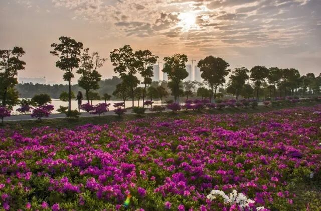 在杜鹃花开的季节,三角咀湿地公园中或红或紫的杜鹃盛开在错落有致的绿树丛中,与水中倒影组成了一幅妙趣横生的生态画卷,与郁郁葱葱的池杉,相映成画。