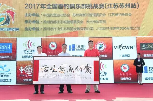 ▲中国钓鱼运动协会副会长、江苏省钓鱼协会主席徐山瀑,国家体育总局社会体育指导中心副主任、中国钓鱼运动协会秘书长尹国臣赠送书法作品,苏州西部生态城党工委副书记、管委会主任,镇湖街道党工委书记徐建龙代表西部生态城接受。