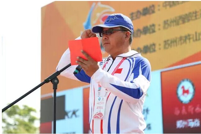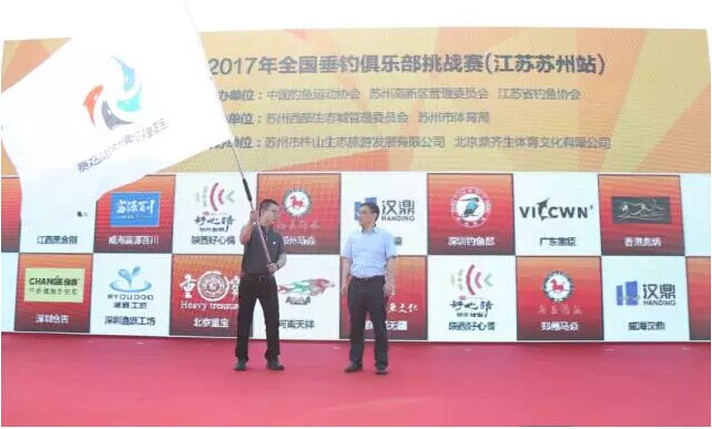 ▲国家体育总局社会体育指导中心三部主任、中国钓鱼运动协会副秘书长苏宝生与苏州西部生态城党工委副书记、管委会副主任、镇湖街道党工委副书记、办事处主任傅曦进行赛旗交接仪式。