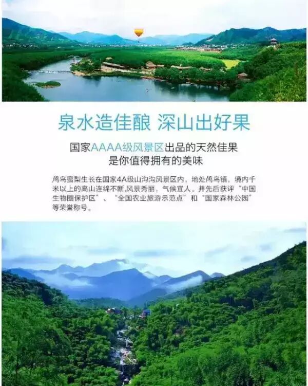 鸬鸟镇境内旅游资源丰富,有著名的山沟沟景区和仙山谷漂流景区。正是如此优越的地理环境,加上充足的光照和雨水,悬殊的日夜温差,孕育了个大形美的鸬鸟蜜梨。