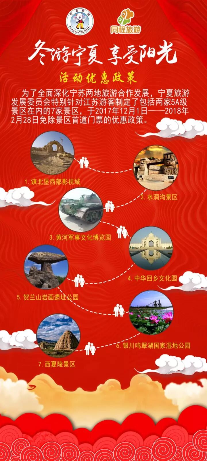 近年来同程旅游深入与宁夏回族自治区旅游发展委员会合作,为了配合此次冬季旅游推介活动,同程旅游官网、手机客户端(APP) 同步上线了“宁夏冬季旅游产品”宣传产品专题,在线下,同程旅游华东10家线下体验店同步开启宁夏旅游宣传体验活动。