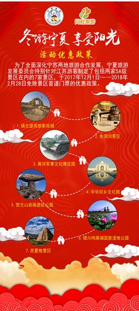 推介会上,宁夏旅游发展委员会专门针对江苏游客,提供了优惠的旅游产品。对于来到宁夏旅游的游客们最大的优惠就是免首道门票。具体优惠是,即日起至2018年2月28日,镇北堡西部影视城、水洞沟景区、黄河军事文化博览园、中华回乡文化园、贺兰山岩画遗址公园、银川鸣翠湖国家湿地公园、西夏陵景区等7家景区向江苏游客免除景区首道门票。