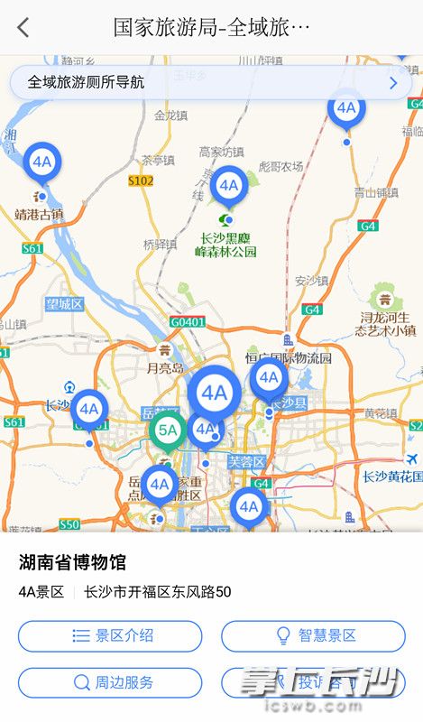 长沙4A、5A级景区已经无缝对接“全国全域旅游全息信息服务系统”,那么该系统的体验感如何呢?记者打开了最新版的高德地图,在右上角可以看到两个正方形叠加组成的“全域旅游”按钮。进入“全域旅游全息信息服务系统”,便可以在地图上看到长沙所有4A、5A级景区的分布。 以湖南省博物馆为例,当记者在地图上点击该景区的标识,便会出现“湖南省博物馆、4A景区、长沙市开福区东风路50号”的字样,下边附有“景区介绍”“智慧景区”“周边服务”“投诉咨询”等四个菜单栏。