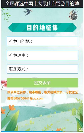 2018全民评选中国十大最佳自驾游目的地活动H5征集链接:https://x.eqxiu.com/s/C2QMqHuR?eqrcode