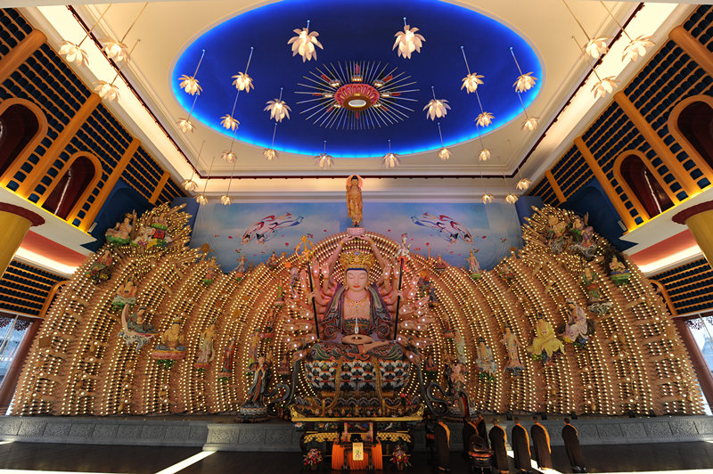 游览观音文化博览园(悟空寺),原名招隐院,始建于梁代,为江南名刹,供奉着唐代泗州大圣僧伽的真身舍利。重建的悟空寺为仿宋风格,殿内融入镭射和激光技术进行声光电设计,形象神秘。