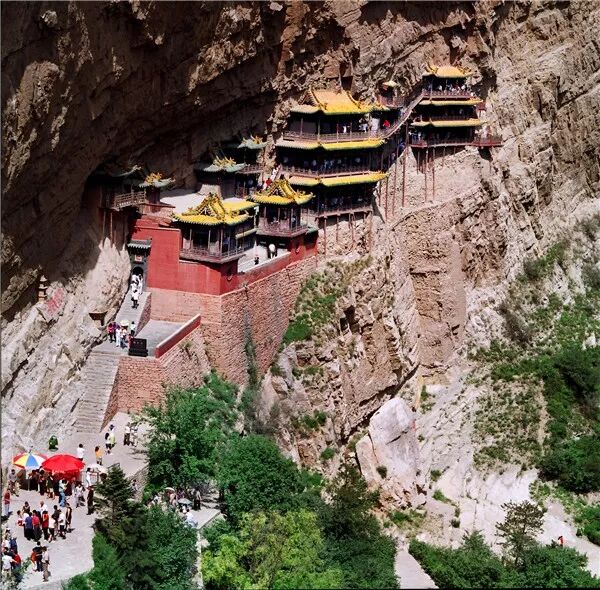 悬空寺:恒山脚下的悬空寺,背倚绝壁,下临深谷,踩在木质的楼梯上, 吱吱的摩擦声回荡着历史的沧桑