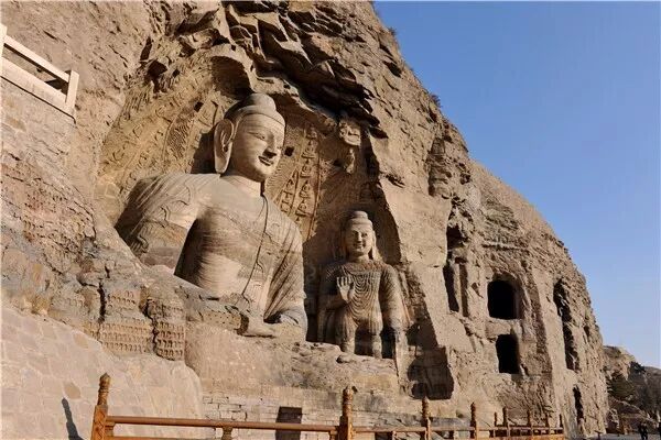 云冈石窟:是中国四大石窟之一,在这绵延一公里的石雕群中,他们形态各异,神采动人,内容丰富多彩,堪称公元5世纪中国石刻艺术之冠,被誉为中国古代雕刻艺术的宝库。