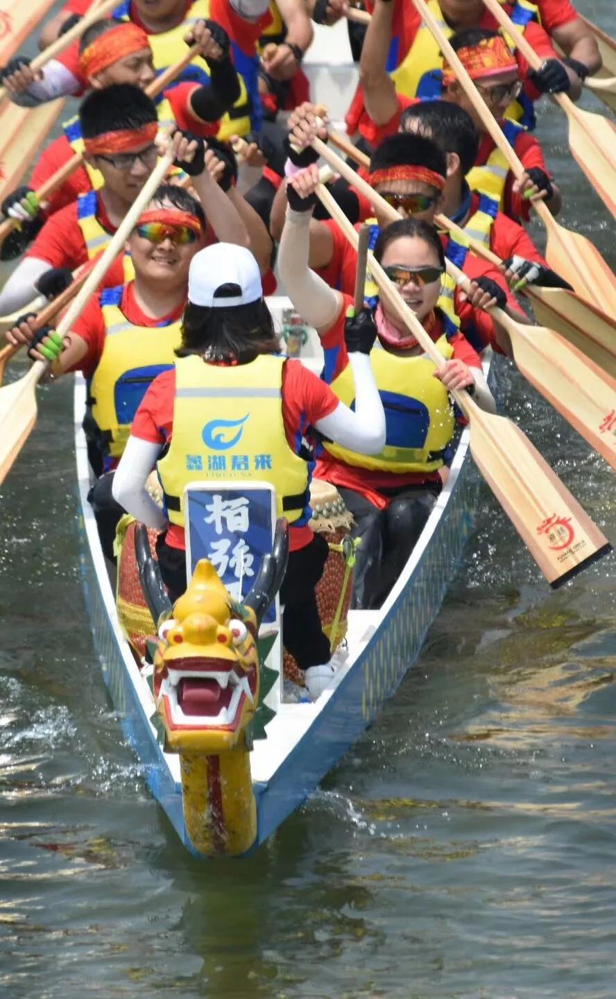 龙舟河两岸人声鼎沸,数万名市民和游客涌向现场,近距离欣赏水上大战。开赛前,8支参赛队伍集结在水面上,现场嘉宾为龙舟点睛。在气势恢宏的助威声中,经过预赛、半决赛、名次赛、决赛近两个半小时的激烈角逐,最终,中国银行代表队凭借突出的实力和顽强的毅力从15支参赛队伍中脱颖而出,以2分08秒48一举夺魁,月城镇双泾村代表队和沿山村代表队分获二三名。