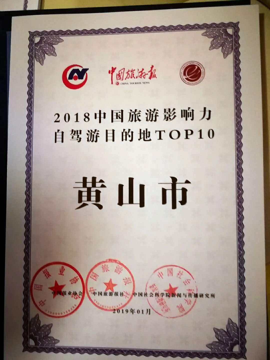 经文化和旅游部批准,1月23日,以“新时代 新视野 新传播 新动能”为主题的2019中国旅游产业发展年会在京落下帷幕。会上揭晓“2018年中国旅游产业影响力风云榜”,安徽省黄山市荣获2018中国旅游影响力自驾游目的地TOP10。