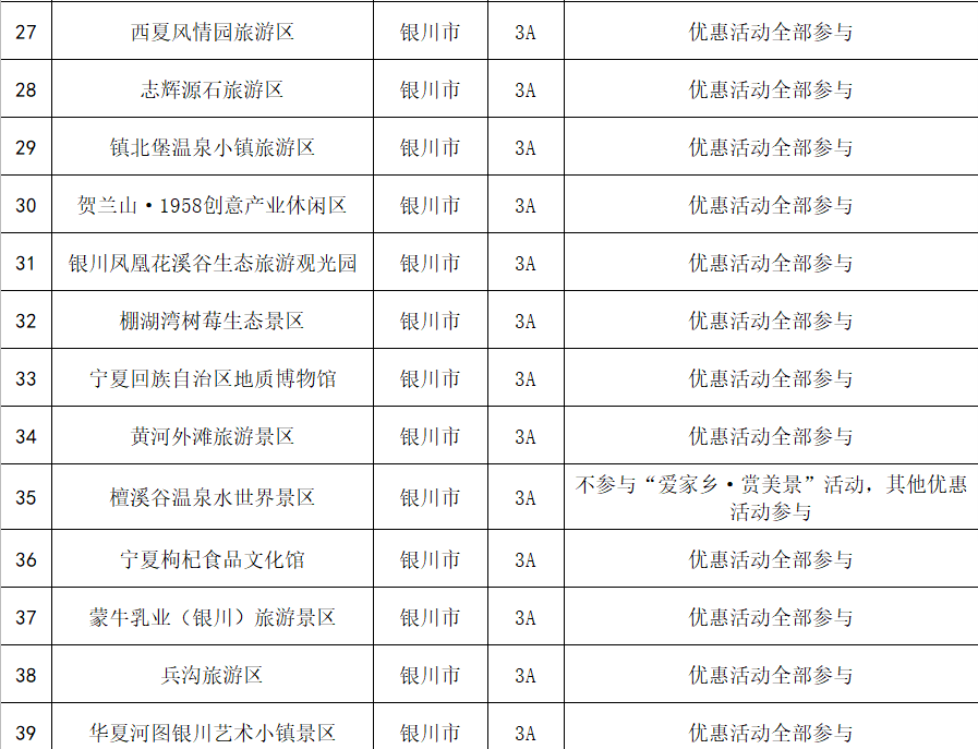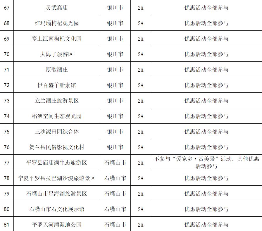 其中,檀溪谷温泉水世界、天山海世界和平罗县庙庙湖生态旅游区3家景区不参与“爱家乡·赏美景”宁夏人游宁夏活动,其他优惠活动参与。