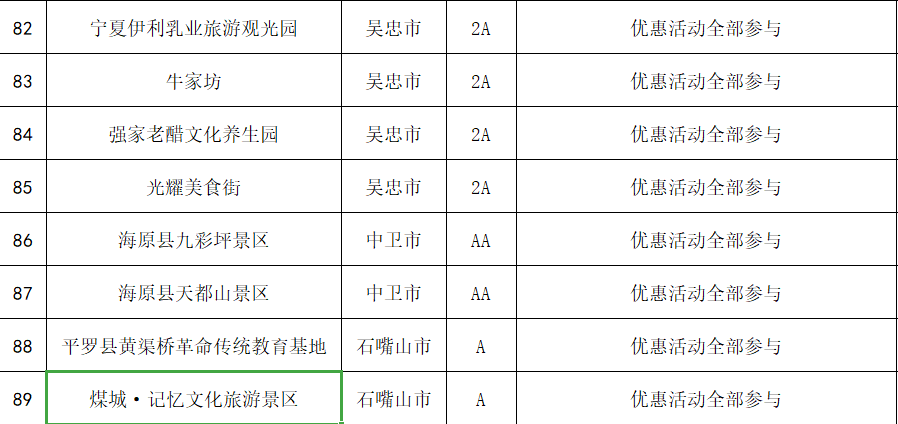 参与此次“爱家乡·赏美景”宁夏人游宁夏、湖北人“放心游宁夏”活动的景区共计89家。