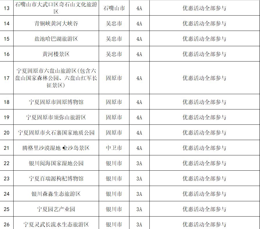 贺兰山国家森林公园、西夏陵景区、贺兰山岩画景区、黄沙古渡原生态旅游区、黄河军事文化博览园、张裕摩塞尔十五世酒庄、银川鸣翠湖国家湿地公园、黄河横城旅游度假区、石嘴山市大武口区奇石山文化旅游区、青铜峡黄河大峡谷、盐池哈巴湖旅游区、黄河楼景区、宁夏固原市六盘山旅游区(包含六盘山国家森林公园、六盘山红军长征景区)、宁夏固原市固原博物馆、宁夏固原市须弥山旅游区、宁夏固原市火石寨国家地质公园、腾格里沙漠湿地·金沙岛景区。