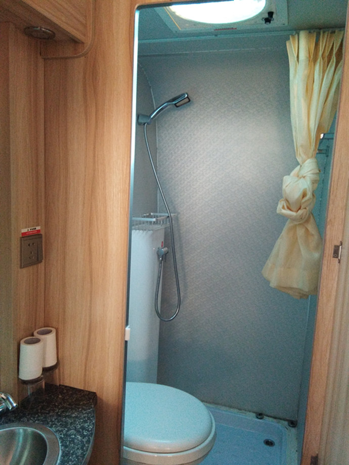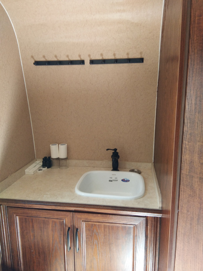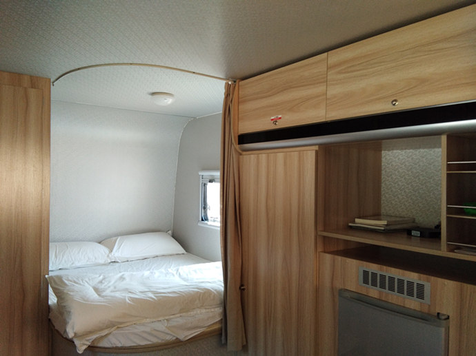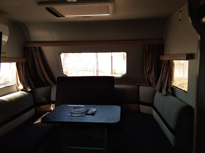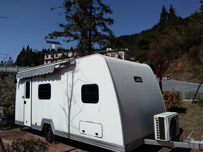 欧美版房车共有两台,分别是878和888,除内饰不同,房车内空调、电视、卫浴齐全,四周窗户可打开通风。因山上天气多变,多有阵雨,切不可打开天窗,以免床铺淋雨。