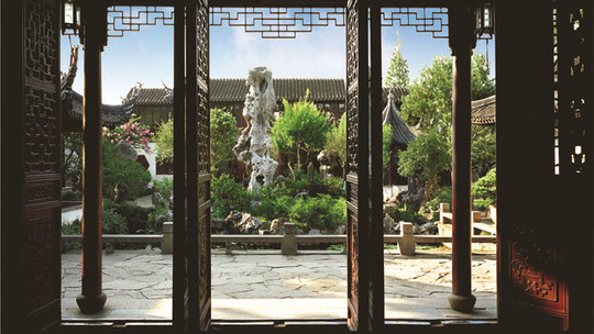 留园以其独创一格、收放自然的精湛建筑艺术而享有盛名。层层相属的建筑群组,变化无穷的建筑空间,藏露互引,疏密有致,虚实相间,旷奥自如,叹为观止。全园分成主题不同、景观各异的东、中、西、北四个景区,景区之间以墙相隔,以廊贯通,又以空窗、漏窗、洞门使两边景色相互渗透,隔而不绝。