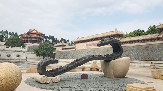 财神金殿设计方正稳重,筑于花岗岩基座之上,寓意财富堆积如山,基业永固整座建筑金光闪闪,耀目生辉,远看就像一座金山。