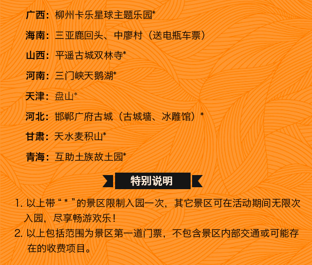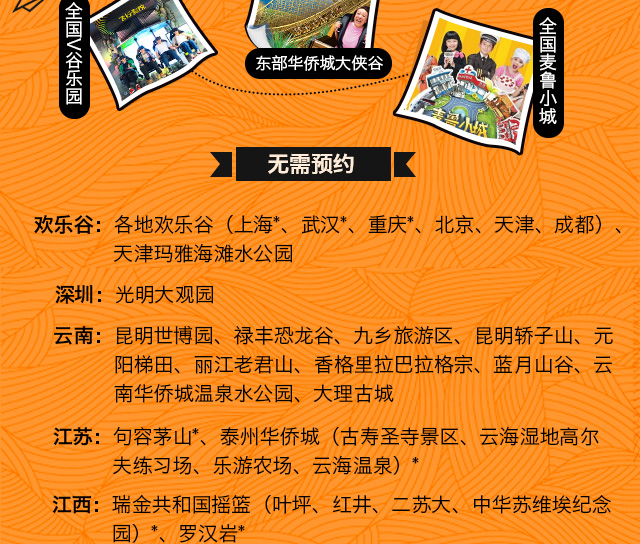 5、云南:昆明世博园、禄丰恐龙谷、九乡旅游区、昆明轿子山、元阳梯田、丽江老君山、香格里拉巴拉格宗、蓝月山谷、《梦幻腾冲》演出、《疯狂动物城之马戏团大围捕》演出、《魔幻之旅》演出、云南华侨城温泉水公园、大理古城