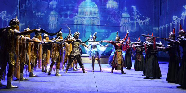 《沙坡头盛典》是一台大型全息浸没式魔幻情境体验剧。该剧充分利用全息影像、威亚、巨型升降舞台等现代舞美前沿科技,丰富剧场空间纵深层次,以观演一体的方式颠覆了传统的表现形式,使整个剧场的潜能无限放大,演员在不同空间移动,观众则以“介入者”的身份进入剧情,跟随演员共同推动剧情的发展,具有极强的融入感和互动性。