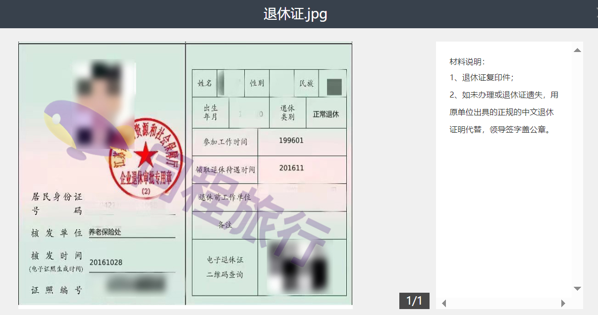 | 工作证明 | ★退休证【电子档】 | 以下材料三选一提供: 注:退休证原件请在递签当天携带至签证中心 退休证 | |