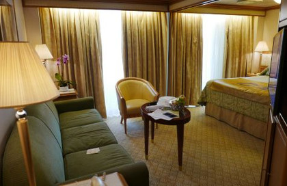 位于甲板前段;私人阳台,有两间独立舱房由一个客厅相连接。两张可合并的单人床、起居室、浴缸及淋浴浴室(升级按摩功能)、衣帽间、写字台、电视、冰箱、电话、电热水壶、吹风机。配备沙发床以容纳第五六位客人。所有舱房内均提供毛巾、香皂、沐浴露、洗发露、牙刷、牙膏、一次性拖鞋 。