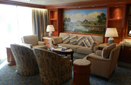位于甲板后段;私人阳台,两张可合并为双人床的单人床,起居室、浴缸及淋浴浴室(升级按摩功能)、落地衣柜、写字台、电视、冰箱、电话、电热水壶、吹风机。配备沙发床以容纳第三四位客人。所有舱房内均提供毛巾、香皂、沐浴露、洗发露、牙刷、牙膏、一次性拖鞋 。