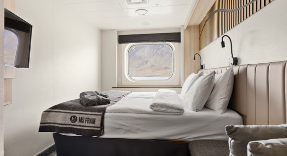 上层甲板客舱(5/6层)| 景观窗 | 大床(可选双床)| 可根据要求提供浴袍和拖鞋