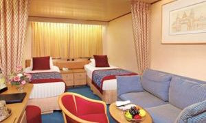 位于甲板前段(2)尾段(2,6,7);两张标准床,可合并成一张大号床,淋浴,客舱设施包括:具有高级欧亚床垫和细棉布床单的豪华床,100%埃及棉豪华华夫编织的毛巾和浴袍,高级按摩淋浴喷头,5倍放大镜化妆镜子,吹风机,香皂,润肤液,洗发水,免费新鲜水果,冰箱中有饮料。平板电视和DVD播放机,擦鞋服务,24小时客房服务。