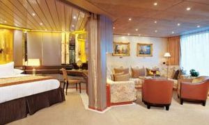 位于甲板尾段(1)前段(2);两张标准床,可合并成一张大号床,淋浴,客舱设施包括:具有高级欧亚床垫和细棉布床单的豪华床,100%埃及棉豪华华夫编织的毛巾和浴袍,高级按摩淋浴喷头,5倍放大镜化妆镜子,吹风机,香皂,润肤液,洗发水,免费新鲜水果,冰箱中有饮料。平板电视和DVD播放机,擦鞋服务,24小时客房服务。