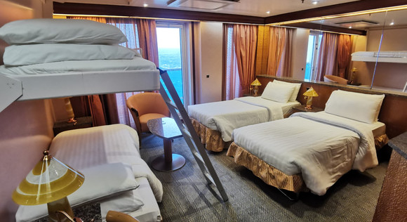·设施:房间内可以选择两张单人床或合并为一张双人床,部分阳台舱另有一张单人沙发床,部分房间配有下拉床,最多可以入住4人,有卫生间及浴室。房间还配备电视、保险箱、吹风机、电热水壶、毛巾、浴巾...