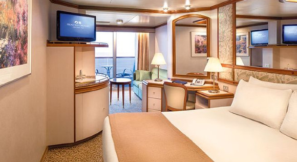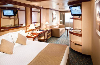 ·设施:位于甲板中段;房间配有两张单人床(可转换成一张大床),沙发床以供第三位客人入住。房间配有私人阳台,私人起居空间,带有浴缸和淋浴的浴室,洗发水,护发素,润肤露,100%埃及棉床单,卫...