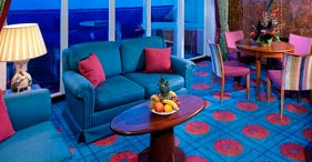 休息区(床头柜,2个小床可转换为大床,加上附加床,可容纳更多的乘客),豪华浴室(厕所,水槽,淋浴,浴室产品,吹风机),休息室(桌子,椅子,平板电视,保险柜,冰箱,直拨电话),分体式空调。地板天花板连接滑动门可通向私人阳台,阳台上附有休息家具。(1圆桌、2椅子或2个日光椅)