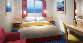 休息区(床头柜,2个小床可转换为大床,加上附加床,可容纳更多的乘客),豪华浴室(厕所,水槽,淋浴,浴室产品,吹风机),休息室(桌子,椅子,平板电视,保险柜,冰箱,直拨电话),分体式空调。
