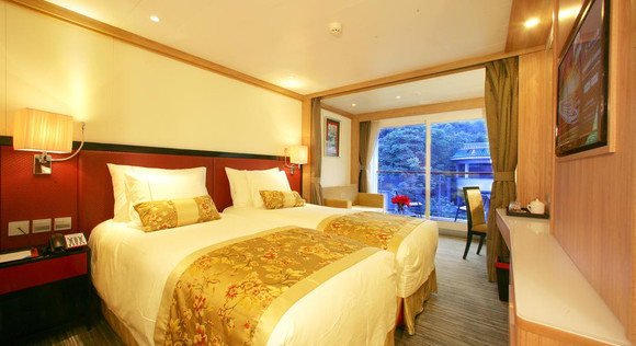 ·设施:两张单人床,私人阳台,遥望两岸风光,俱全的浴室设施(带浴缸),独立卫生间配备淋浴,梳妆区,配备有电视,洗漱用品*2,拖鞋*2,睡衣*2,保险柜*1全部免费使用,中央空调(冷/热都有...