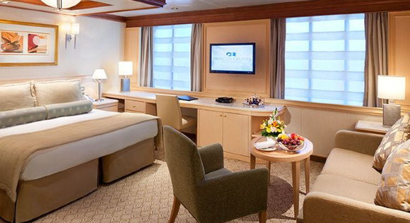 位于甲板中前段;房间配有两张单人床(可转换成一张大床),沙发床以供第三位客人入住,部分房间配有下格床以供第四位客人入住。房间配有超大起居空间,有超大方窗,可欣赏海景。带有淋浴的浴室,洗发水,护发素,润肤露,100%埃及棉床单,卫星电视,冰箱,吹风机,保险箱,电话,日常客房服务。
