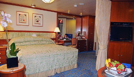 位于甲板后段;房间配有两张单人床(可合并成一张大床),100%埃及棉床单,可选枕头,沙发床(以供第三四位客人入住)。落地窗直达私人阳台,房间面积包含阳台面积。独立的起居空间,步入式衣帽间,独立浴室(淋浴、浴缸、洗发水、护发素、润肤露、吹风机),迷你酒吧,CD/DVD播放器,迷你保险箱,2台平板电视,冰箱,写字桌,电话,提供晚安巧克力、日常客房服务等。位于船尾,美丽海景一览无余。套房客人可优先登离邮轮,优先离开港口,享有离船休息室;优先预定岸上游与餐厅,享有顾客服务VIP通道;免费享用Lotus Spa、当日洗衣与专业清洁服务、擦鞋服务,提供雨伞。