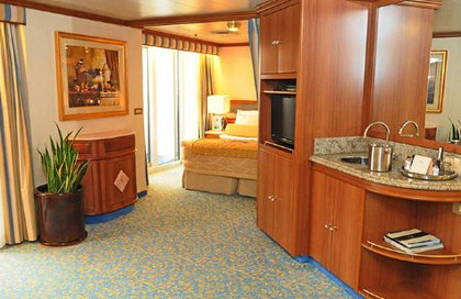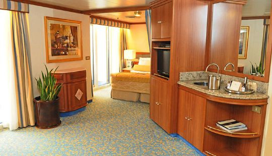 ·设施:位于甲板后段;房间配有两张单人床(可合并成一张大床),100%埃及棉床单,可选枕头,沙发床(以供第三位客人入住)。落地窗直达私人阳台,房间面积包含阳台面积。独立的起居空间,步入式衣...