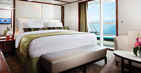 休息区(2个单人床可转换为大床),私人浴室(厕所,水槽,淋浴,浴室产品,吹风机),休息区(衣柜,桌子,椅子,平板电视,音乐控制台,保险箱,茶/咖啡机,迷你酒吧,冰箱,直拨电话,冰桶,玻璃杯),互联网接入,个人空调。所有的客房都提供充足的储藏空间(抽屉,壁橱,架子和小孔)。套房客人还拥有礼宾服务,鞋油,豪华床上用品(枕头菜单,豪华床垫),步入式壁橱,欢迎礼物(香槟,水果,鲜花,瓶装水),意大利浓咖啡、咖啡壶,棉浴衣,拖鞋,毛巾,豪华浴缸产品,优先服务(入住,登船机/下船机,),特别菜单,客房用餐(每晚送餐),免费特色餐厅/牛排餐厅(仅早餐和午餐)。2间卧室(一个有大床,另一个有2张小床),餐厅(6个座位桌),客厅(平台式钢琴),化妆室,试衣区,豪华浴室(浴缸,双水槽,淋浴),客浴室,媒体中心(DVD/CD)。