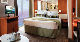 休息区(2个单人床可转换为大床),私人浴室(厕所,水槽,淋浴,浴室产品,吹风机),休息区(衣柜,桌子,椅子,平板电视,音乐控制台,保险箱,茶/咖啡机,迷你酒吧,冰箱,直拨电话,冰桶,玻璃杯),互联网接入,个人空调。所有的客房都提供充足的储藏空间(抽屉,壁橱,架子和小孔)。套房客人还拥有礼宾服务,鞋油,豪华床上用品(枕头菜单,豪华床垫),步入式壁橱,欢迎礼物(香槟,水果,鲜花,瓶装水),意大利浓咖啡、咖啡壶,棉浴衣,拖鞋,毛巾,豪华浴缸产品,优先服务(入住,登船机/下船机,),特别菜单,客房用餐(每晚送餐),免费特色餐厅/牛排餐厅(仅早餐和午餐)。