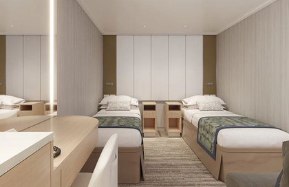 ·设施:位于甲板前段(9,10)后段(8,11);客舱内有两张单人床,可转换成一张大号床,衣柜的空间大,带淋浴的私人浴室,有抽屉的办公桌。每个客舱有专属的电视,恒温控制空调,冰箱,个人保险...